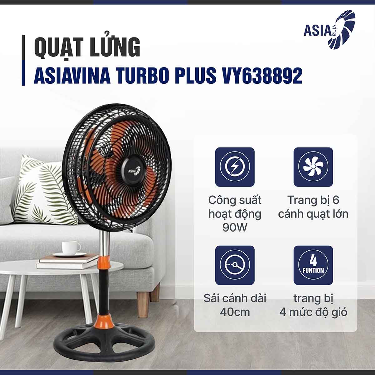 Quạt lửng Asia VY638892 có 6 cánh quạt đường kính 40cm giúp tạo luồng gió mạnh, làm mát hiệu quả cho phòng khách, phòng ngủ hay phòng ăn....